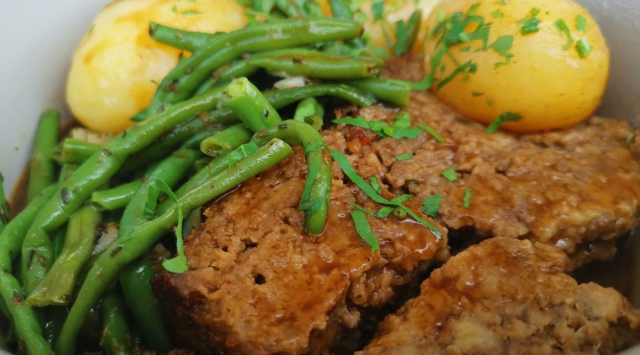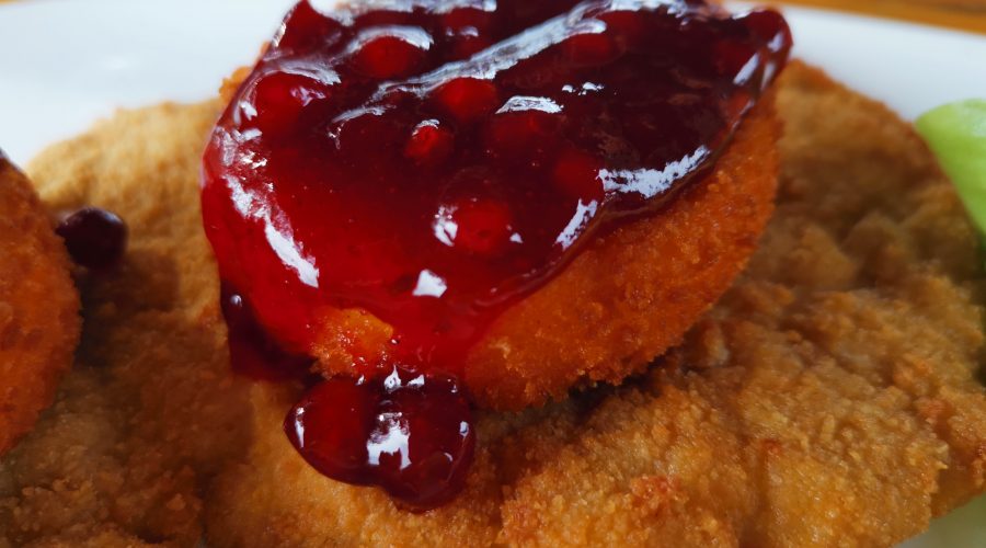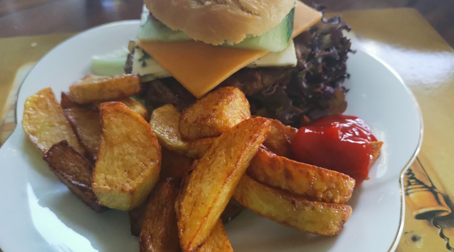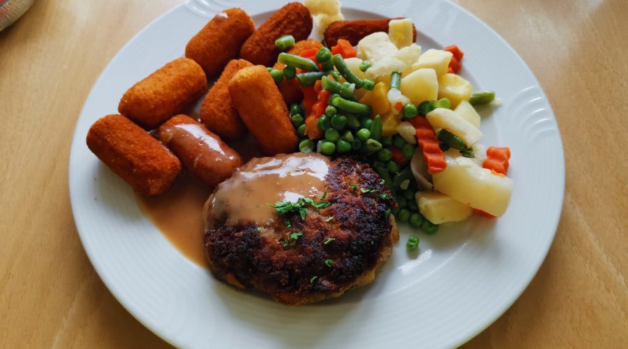Eine Kartoffelcreme-Suppe und ein üppiger Beilagen-Salat vom Buffet bilden schon einmal eine gute Grundlage für den ersten Gang ? Gestatten: Herr Frikadelle in Krokette – …